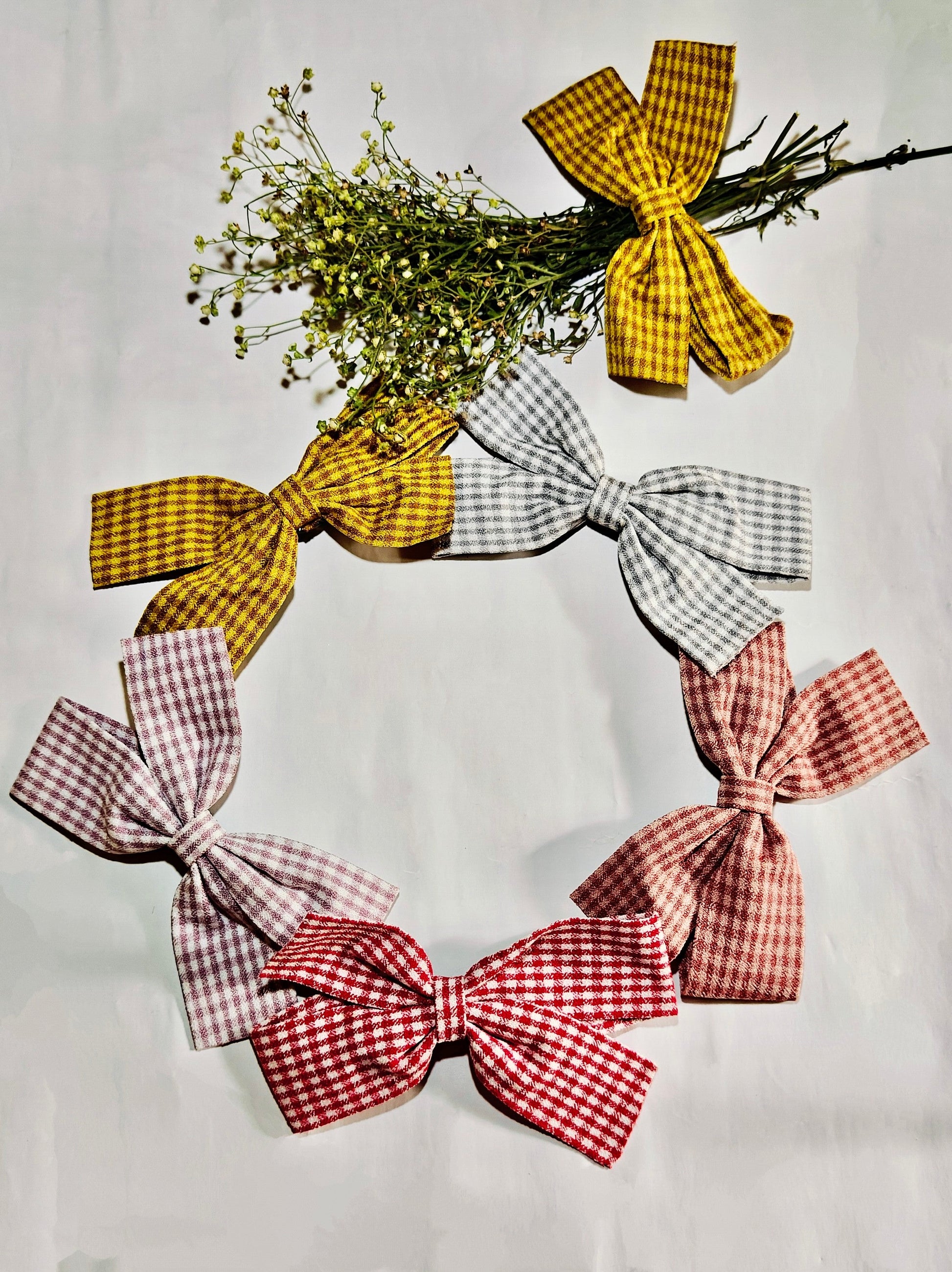 Add a timeless touch to your look with this set of 6 handmade gingham bows in soft, rustic shades – mustard, grey, maroon, blush, lavender, and red. Made from premium cotton, they’re perfect for girls and women to style ponytails, half-ups, or accessorize bags. Ideal for daily wear, photoshoots, or gifting!