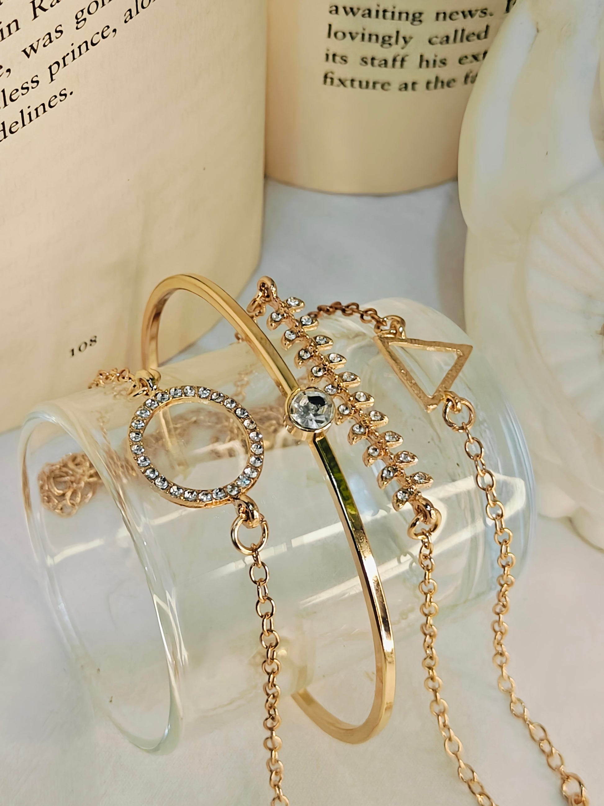 Add a touch of elegance to your everyday look with this gold-plated bracelet set. Featuring four unique designs — a sleek bangle with a sparkling stone, a delicate crystal chain, a minimalist triangle charm, and a dazzling circle charm — this set perfectly blends modern style with timeless sophistication. Wear them together for a stacked look or mix and match for versatile styling.
