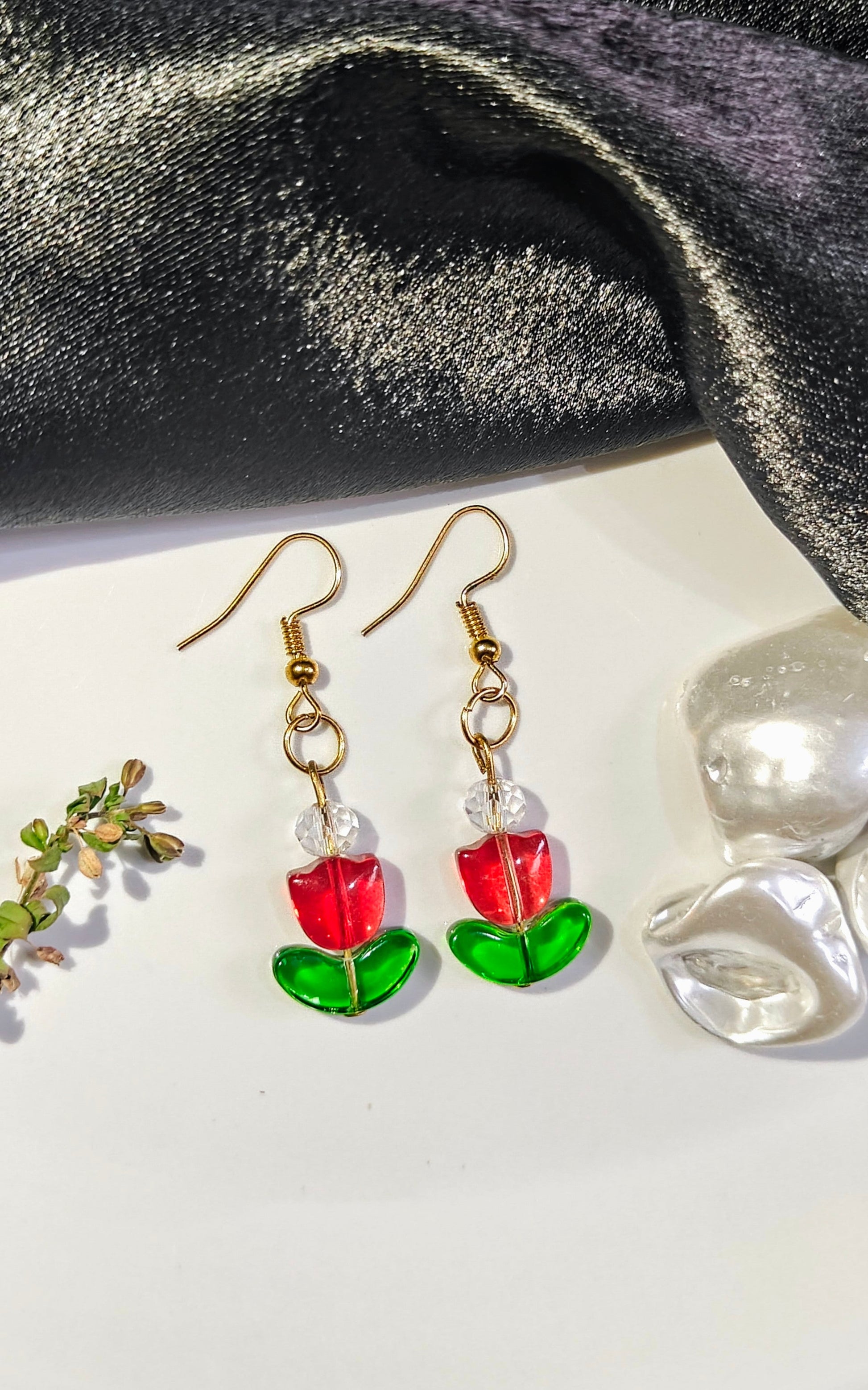 Bring a pop of spring to any outfit with these whimsical tulip-inspired drop earrings. A faceted clear crystal bead crowns each earring, flowing into a vibrant red glass tulip “blossom,” and glossy green glass “leaves,” all suspended from gold-toned findings. Lightweight and full of color, they’re an effortless choice for casual days, garden parties, or thoughtful gifting.
