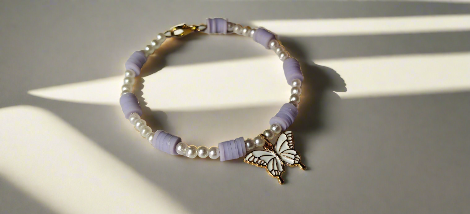 Let your style take flight with our Lavender Pearl Butterfly Bracelet. This elegant handmade piece features a graceful mix of glossy faux pearls and soft lavender clay discs, beautifully accented with a charming gold-edged butterfly pendant. The blend of delicate textures and soft tones adds a dreamy, feminine touch to any outfit. Lightweight and comfortable, it’s a perfect accessory for both everyday wear and special occasions.