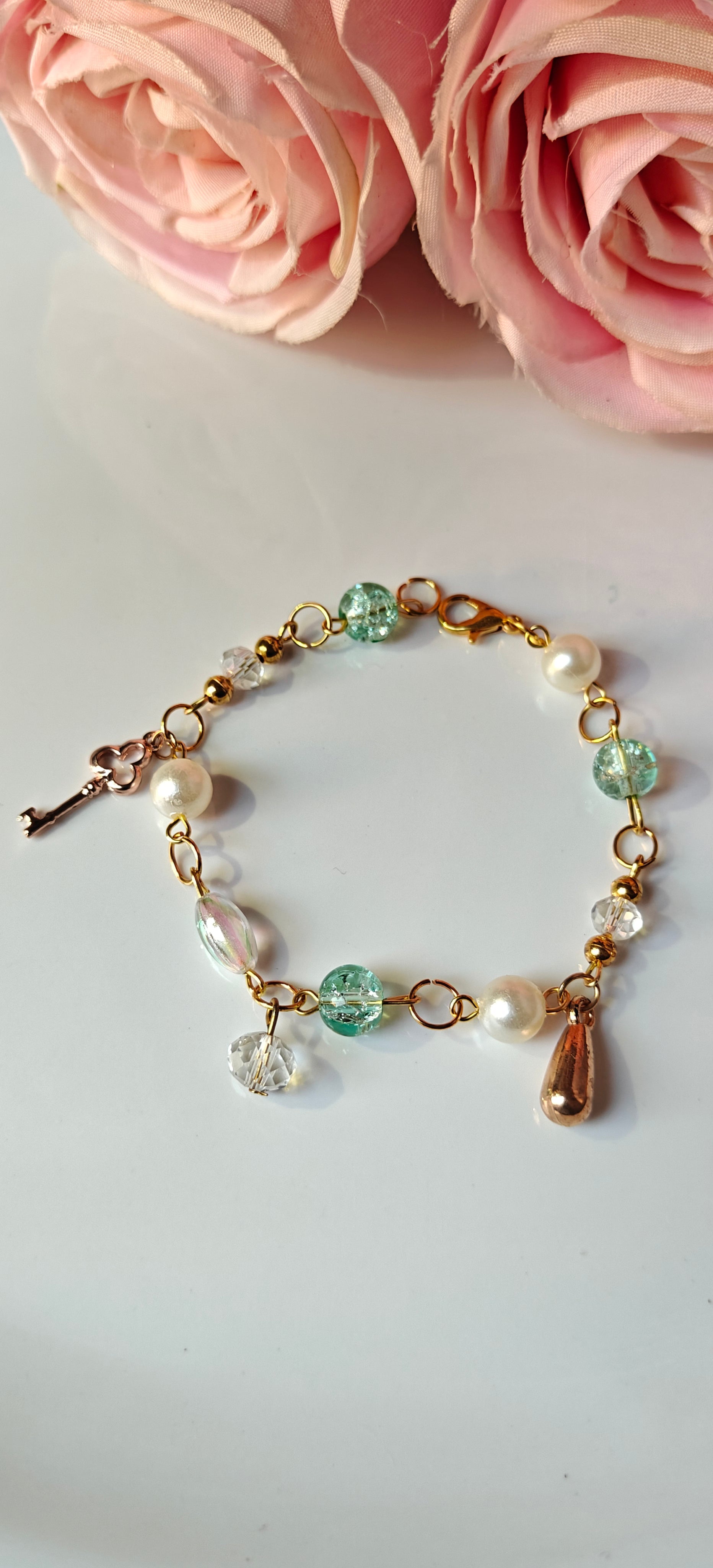 Add a soft, whimsical touch to your look with our Pastel Charm Crystal Beaded Bracelets Set. Featuring four beautifully crafted bracelets, each piece is adorned with shimmering crystal beads, faux pearls, and delicate gold-toned charms including keys, anchors, hearts, and more. The dreamy pastel colors and elegant detailing make this set perfect for casual chic outfits, gifting, or stacking for a romantic statement.
